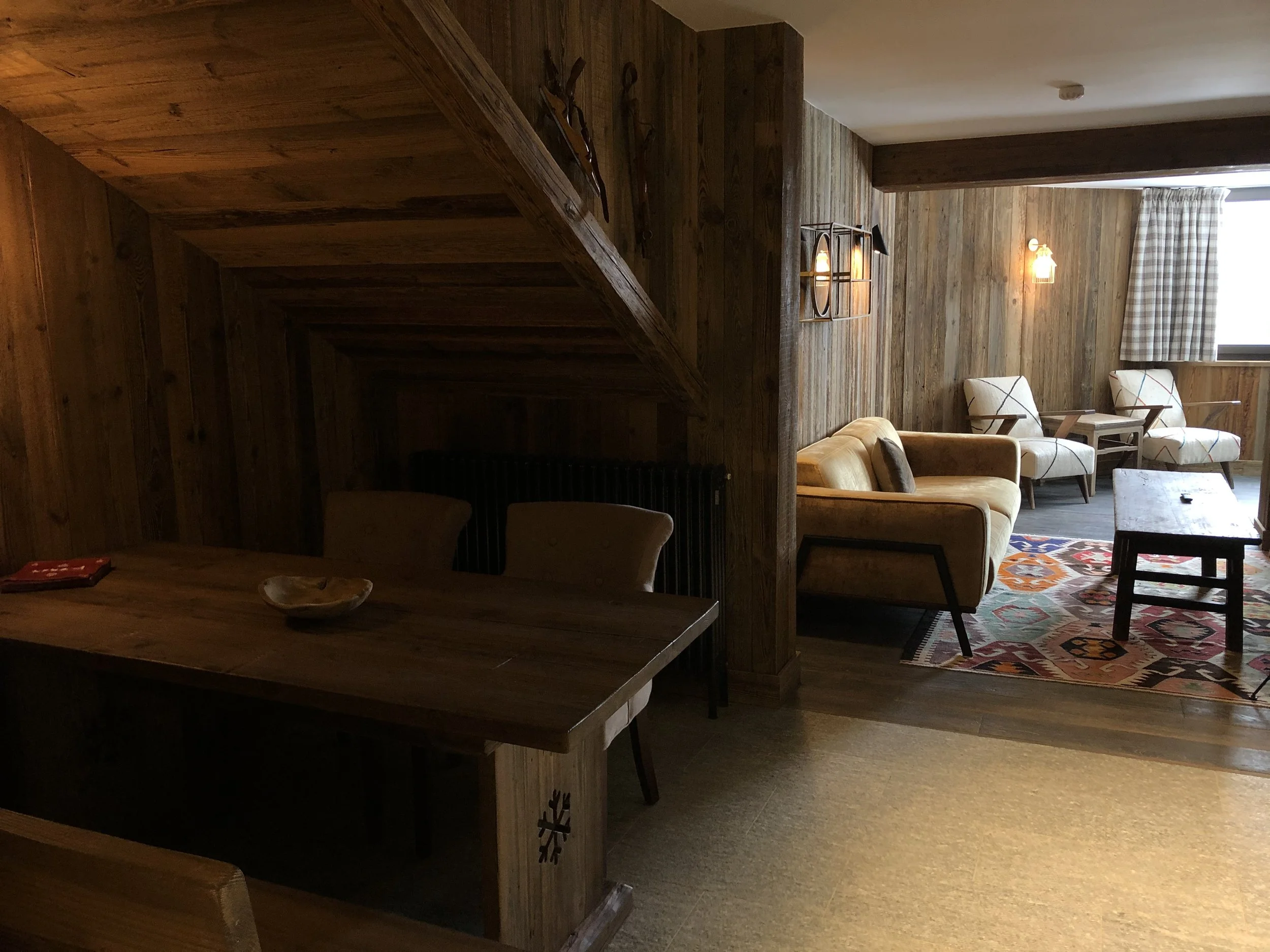 The Val d'Isère Café is a true lively place, open all day from breakfast to dinner in a timeless and relaxed spirit. With a vintage and alpine decor and unabashed kitsch touches, the light wood, green and pink colours set the tone and revive the club chairs' leather.