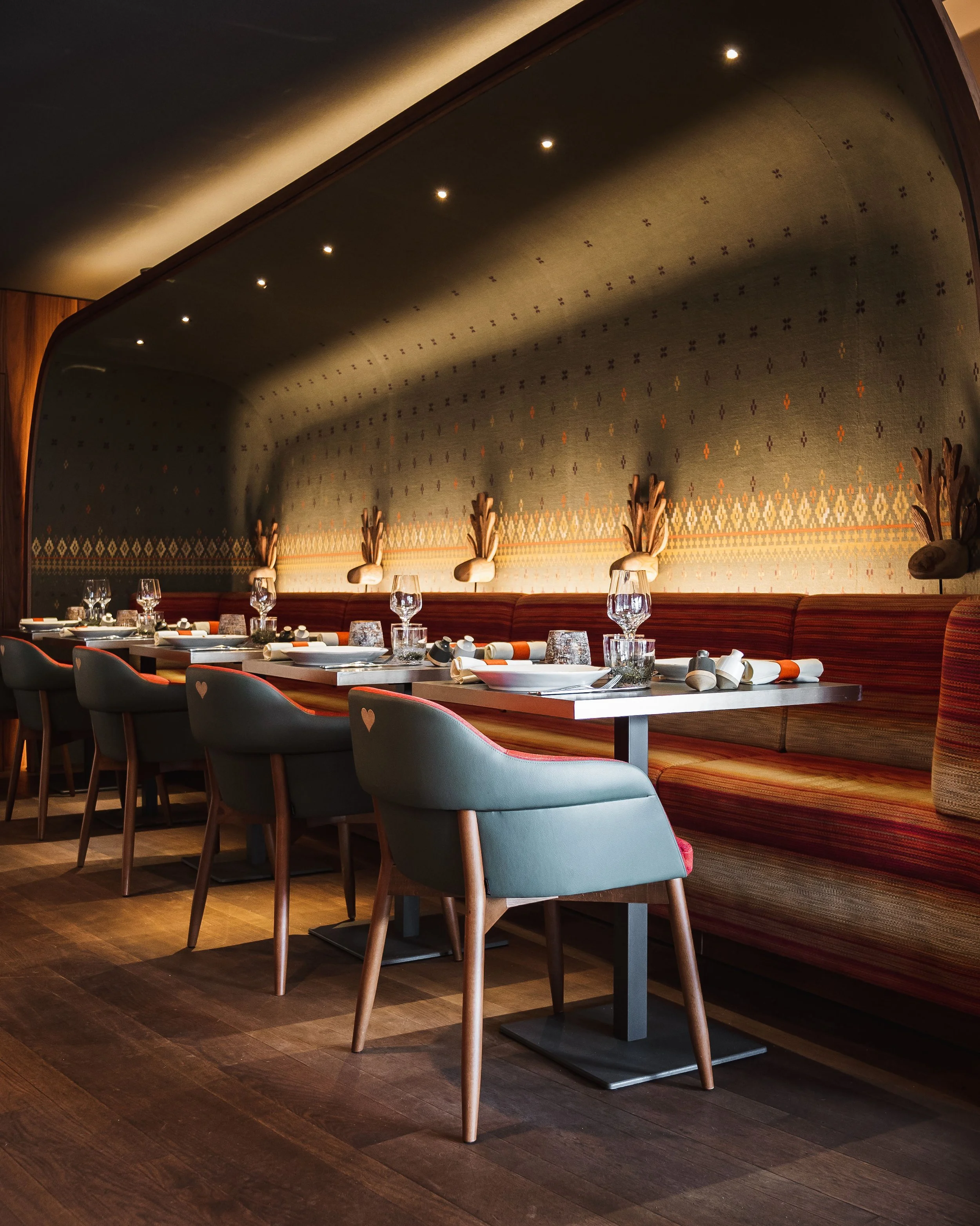 The restaurant La Muse is one of Megève’s most popular restaurants for locals and travellers alike. Open on the busy pedestrian street on one side and overlooking the Planay torrent on the other, meals take place in cocooning booths or on a beautiful communal table carved from the trunk of a single tree.